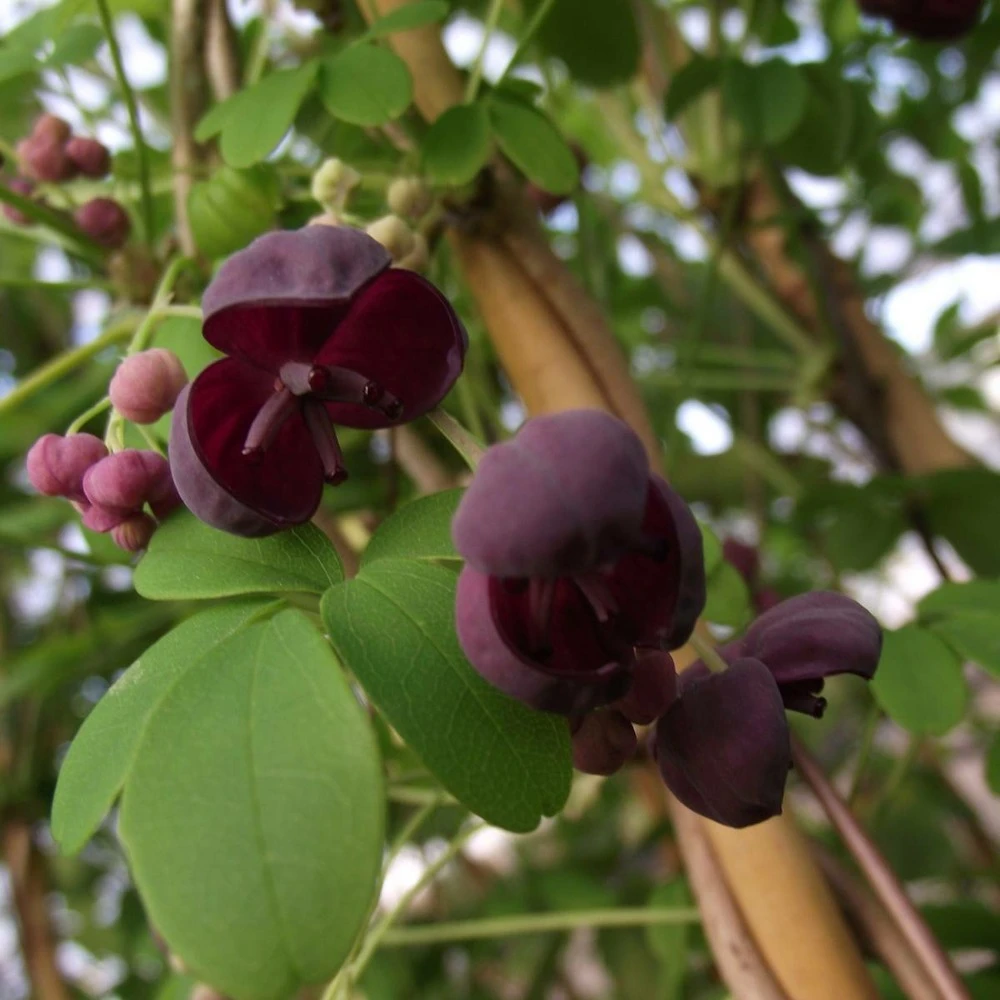 l’akĂ©bie pentaphylle dispose de feuilles Ă 5 folioles et de fleurs violet foncĂ©. Cette plante produit un fruit assez long (ressemblant Ă un cornichon) produisant de nombreuses graines, en revanche celui-ci n’est pas dĂ©clarĂ© comme non comestible, en revanche elle peut provoquer des douleurs abdominales.