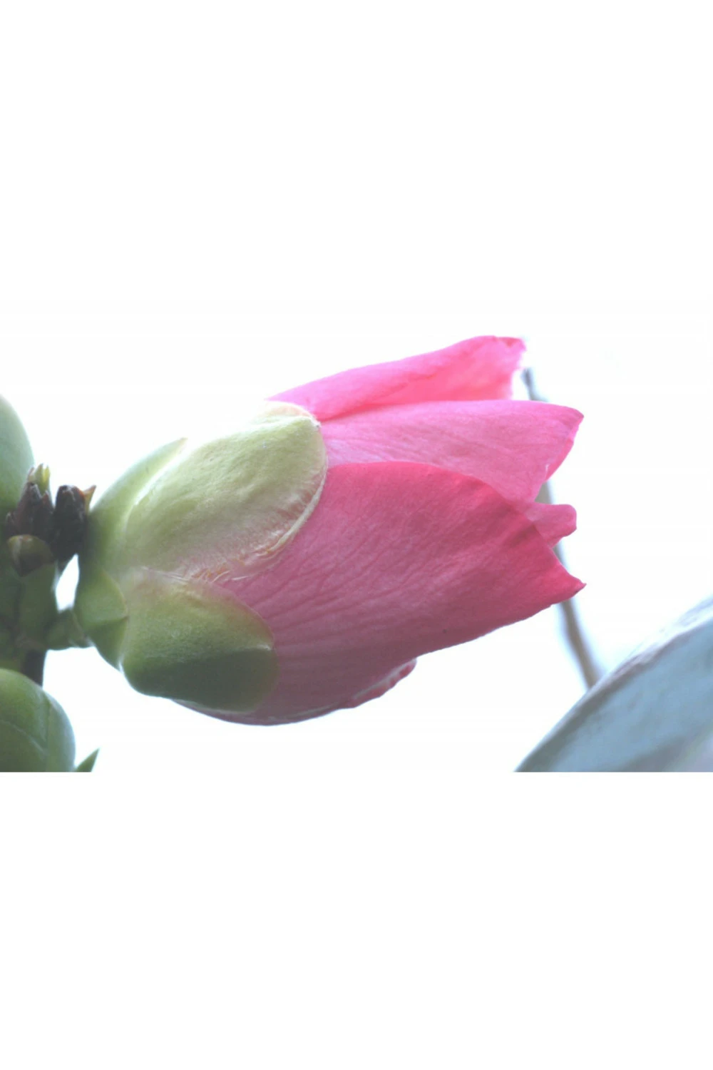feuillage brillant vert olive, port érigé, grande fleur simple rose tendre, devenant plus vif sur le bord des pétales, long pinceau d’étamines jaune vif.