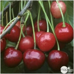 Cette variĂ©tĂ© est très vigoureuse, Ă port Ă©rigĂ©, et très fertile, elle s’adapte facilement Ă tous les porte-greffes. Sa mise Ă fruits est rapide. La floraison Ă la fin du mois de mars, est tout simplement exceptionnelle. Une abondance de petites fleurs blanches orne l’arbre et lui donne cet aspect remarquable. Le fruit est un bigarreau, rĂ©coltĂ© en dĂ©but du mois de juillet. Très gros, de couleur rouge brillant très foncĂ©, il est portĂ© par un petit pĂ©doncule et possède un tout petit noyau. Sa chair est ferme, croquante, sucrĂ©e et acidulĂ©e. Cette variĂ©tĂ© un peu sujette Ă l’Ă©clatement, est pollinisĂ©e par ‘Burlat’, ‘Reverchon’, ou ‘Early River’. Attention, elle est incompatible avec ‘NapolĂ©on’.