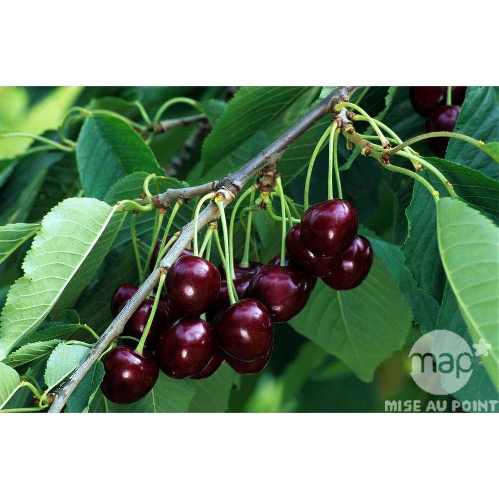 Arbre de grande vigueur, formant une cime large. Sa fertilité est faibles les premières années, mais elle ne cesse d’augmenter avec l’âge. Il a d’ailleurs une grande espérance de vie, et de demande que très peu d’entretien. Il résiste très bien à l’éclatement des fruits. Sa floraison tardive – début avril – permet de le préconiser dans les régions du Nord de la Loire. Le fruit est un très gros bigarreau, qui se récolte fin juin à début juillet. De couleur pourpre foncé brillant, strié de rouge brun, on découvre à l’intérieur sa chair rose très sucrée, croquante, agréablement relevée et acidulée.