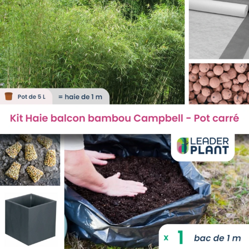ce kit comprend : 1 bambou fargesia campbell en pot de 5 litres, 100/110cm, à planter dans un bac carré 40cmx40cmx40cm à installer sur le balcon ou la terrasse