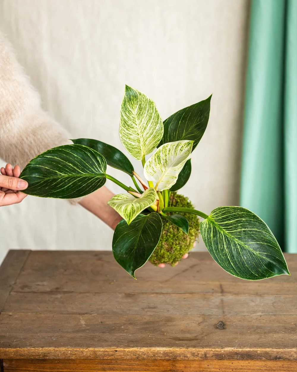 « apparu au japon dans les années 1990, « »koke » » signifie mousse « »dama » » une balle, une sphère mais aussi quelque chose de précieux. Il se compose d’une sphère de mousse remplis de substrat nutritif d’argile, sur laquelle repose une plante ici un joli philodendron birkin.il nécessite relativement peu d’entretien, il suffit de baigner 5-10min la sphère à la moitié dans un grand récipient d’eau 1 à 2 fois par semaine selon la saison. Laissez-la tremper puis s’égoutter quelques minutes.il peut être suspendu en hauteur, ou bien posé sur un objet de déco et peut vivre de nombreuses années si il est bien entretenu. Le kokedama apportera une touche exotique, zen, relaxante et evidemment green à votre intérieur. Pour les japonais, cultiver un kokedama et l’accrocher vers le haut revient à se libérer de la pesanteur et de s’élever vers des dimensions divines d’amour et de paix.lorsqu’il est réalisé, le kokedama peut être suspendu, ou bien posé sur un objet de déco et peut vivre de nombreuses années si il est bien entretenu. Le kokedama apportera une touche exotique, zen, relaxante et évidemment green à votre intérieur. Pour les japonais, cultiver un kokedama et l’accrocher vers le haut revient à se libérer de la pesanteur et de s’élever vers des dimensions divines d’amour et de paix »