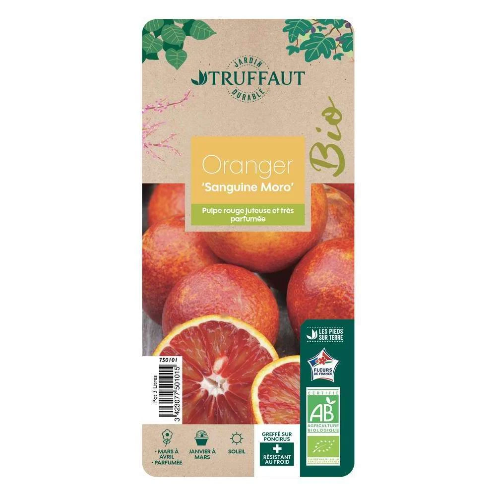 Citrus sinensis (Oranger) est originaire d’Inde, de Birmanie et de Chine. Le fruit est produit en Chine depuis le IIIème siècle. L’orange douce que nous connaissons n’apparait en Europe qu’au XVIème siècle, grâce aux Portugais qui la rapportent de Ceylan et de Chine. La variété ‘Moro’ donne une orange sanguine. Elle est très cultivée en Sicile. Cet agrume, au port arrondi, atteint une hauteur de 6 m pour une largeur de 4 m. Feuillage persistant, vert sombre. Feuilles ovales. Floraison blanche, à odeur suave. Fruits à épiderme rouge violacé, de taille moyenne. Pulpe juteuse, rouge violacé, parfumée. Le fruit est à maturité de janvier à mars. Rustique jusqu’à -7°C.On les plante sur la Côte d’Azur en pleine terre, dans un sol suffisamment argileux, mais perméable et bien drainé. Exposition au soleil, à l’abri des vents. Partout ailleurs, culture en pot en rentrant la plante dans une véranda tenue hors gel, à une température de 10°C environ.