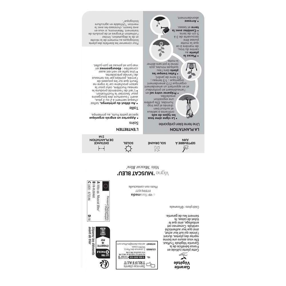 Le genre Vitis (vigne) comprend environ 60 espèces, originaire des régions chaudes et tempérées de l’hémisphère Nord. Vitis vinifera (vigne à vin et vigne de table) est l’espèce la plus connue, originaire vraisemblablement de la région sud-caucasienne et cultivée dés la fin du IVème millénaire au Proche Orient. Elle fut introduite en Gaule par les Romains dans la province de la Narbonnaise. Muscat est une dénomination qui recouvre un ensemble d’environ 200 cépages dont les raisins ont un arôme muscaté, c’est-à-dire très parfumé, rappelant légèrement celui du musc. Il en existe de nombreuses variétés, dont les grains ont une peau allant du jaune pâle au bleu-noir. ‘Muscat Bleu’ est une variété qui a la particularité de produire des grappes aux grains rouge foncé recouverts d’une pruine bleutée. Chair bleutée, ferme, juteuse, acidulée, au goût muscaté. Maturité en septembre. Cette liane formant un cep est souple et se conduit facilement de façon à former des cordons, des gobelets, à couvrir des treilles et des pergolas, à se palisser contre les murs. Plus simple encore : on peut la laisser partir à l’assaut de pylônes. Une solution pratique dans les tout petits jardins. Pousse au soleil dans un sol léger, perméable.